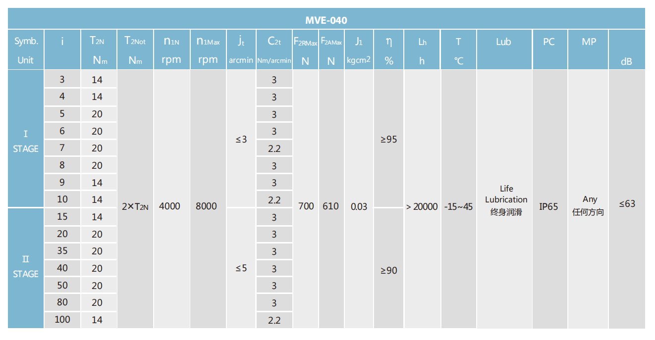 MVE-040-L2系列超精密背隙行星減速機系列(P0): MVE-040-L2系列精密背隙行星減速器系列(P1): MVE-040-L2系列標(biāo)準(zhǔn)背隙行星減速機系列(P2):