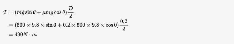 其中,m 為負載重量,g 為重力加速度,θ為斜坡角度(此處為 0 度),μ為摩擦力系數(shù),D 為車輪直徑(假設為 0.2m)。